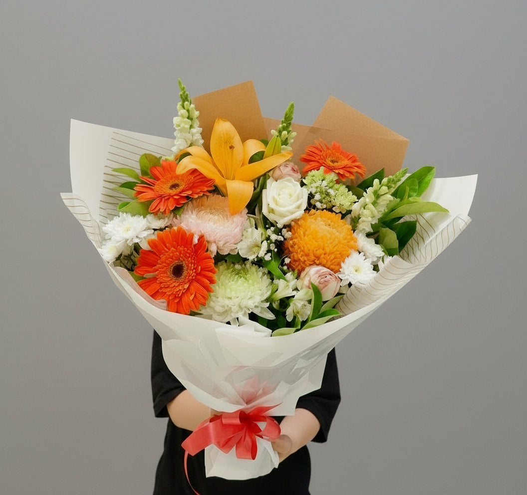 Celebrating the colors of the season with an unexpected twist, this bouquet combines orchard-inspired orange with snowy whites and lush festive greens.