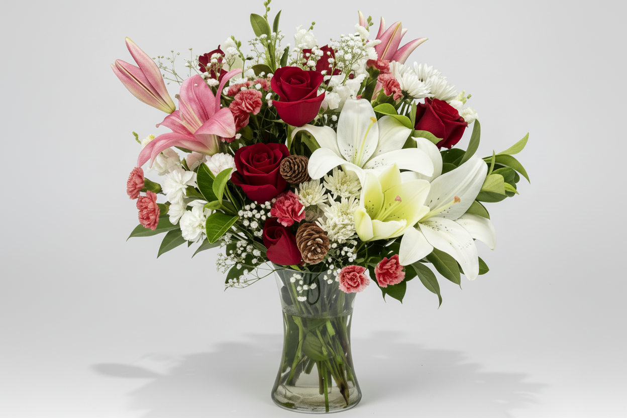 A striking arrangement of deep red florals, fresh pine, and seasonal highlights, designed in a vase to capture the opulence and magic of Christmas celebrations.